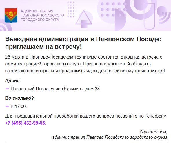 26 марта состоится встреча с главой Павлово-Посадского городского округа Денисом Семеновым и представителями администрации. Разберем ваши обращения и ответим на вопросы!